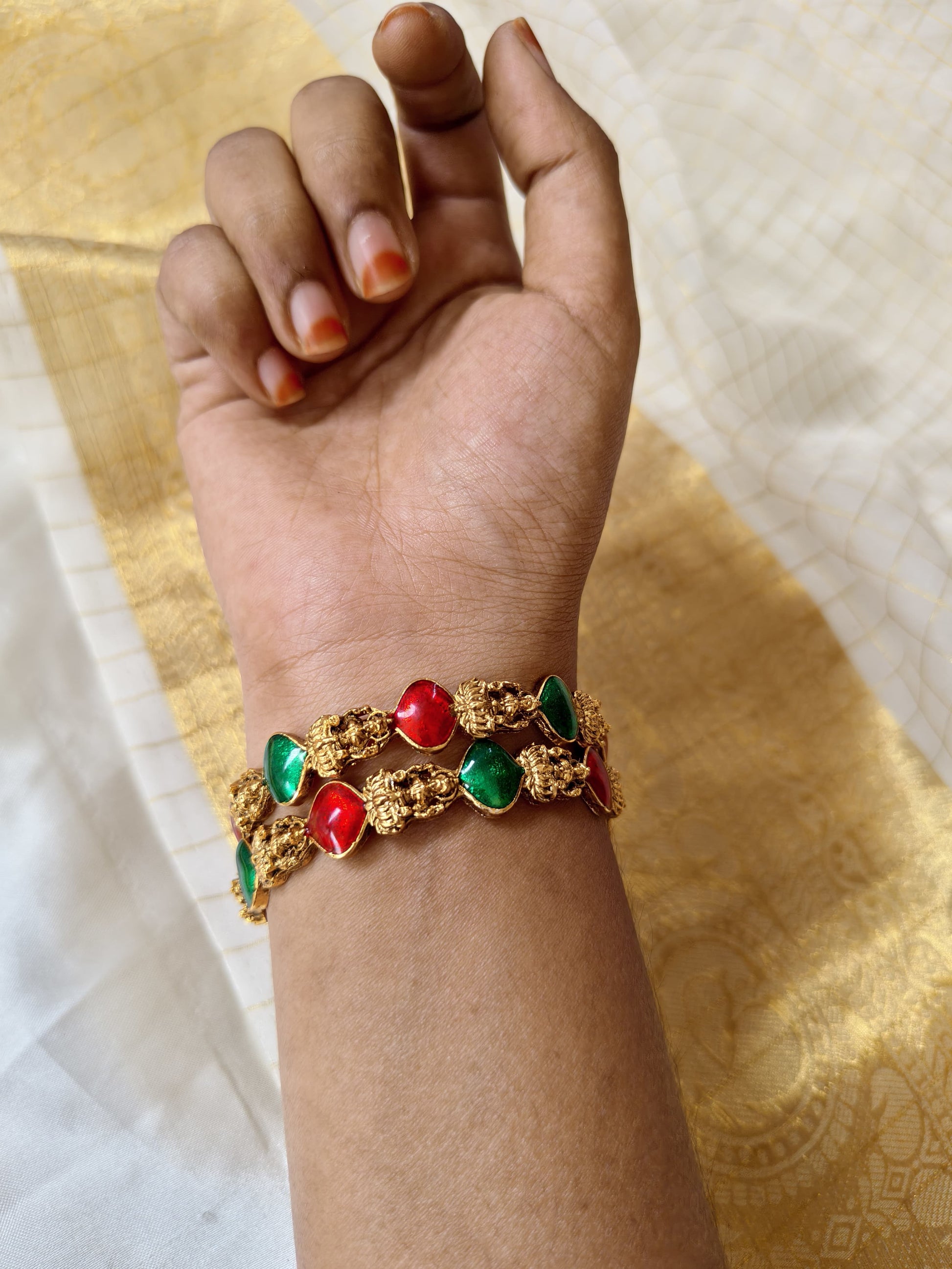 Pachcha Bangles NNB73 exemplify traditional Kerala style jewelry with their intricate craftsmanship and timeless design. These bangles blend elegance with cultural heritage, offering a sophisticated accessory that enhances any ethnic ensemble. Crafted to provide durability and comfort, they are perfect for both daily wear and special occasions, reflecting expert artistry rooted in Kerala’s rich jewelry traditions. set of 2