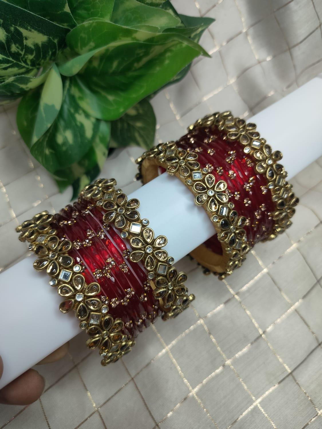 This combo offers a glamorous touch to any outfit with its red and golden silk threads and 12 red glass bangles. Perfect for any occasion, these bangles are both stylish and preety. Includes 2 additional silk thread bangles for added flair.