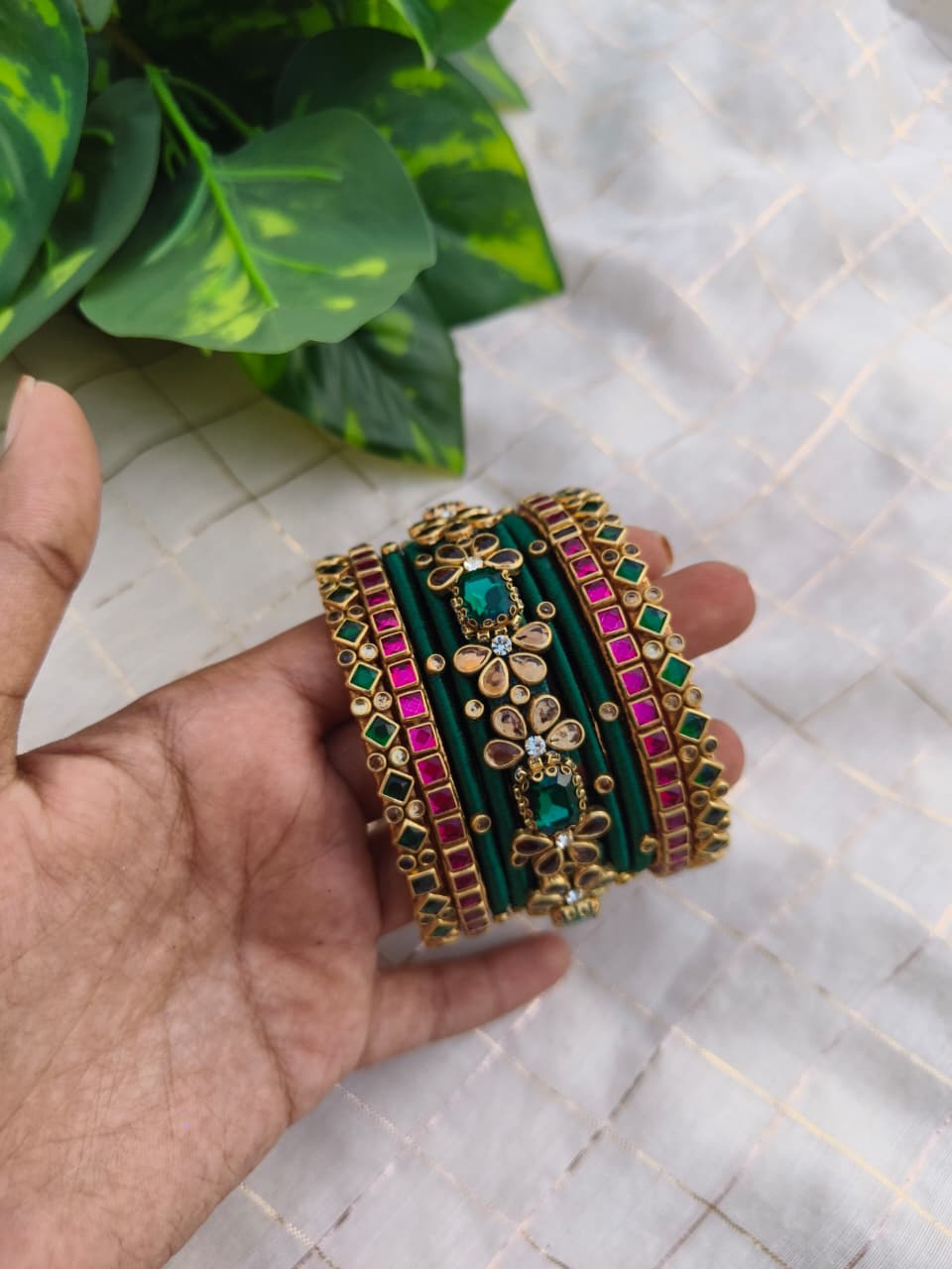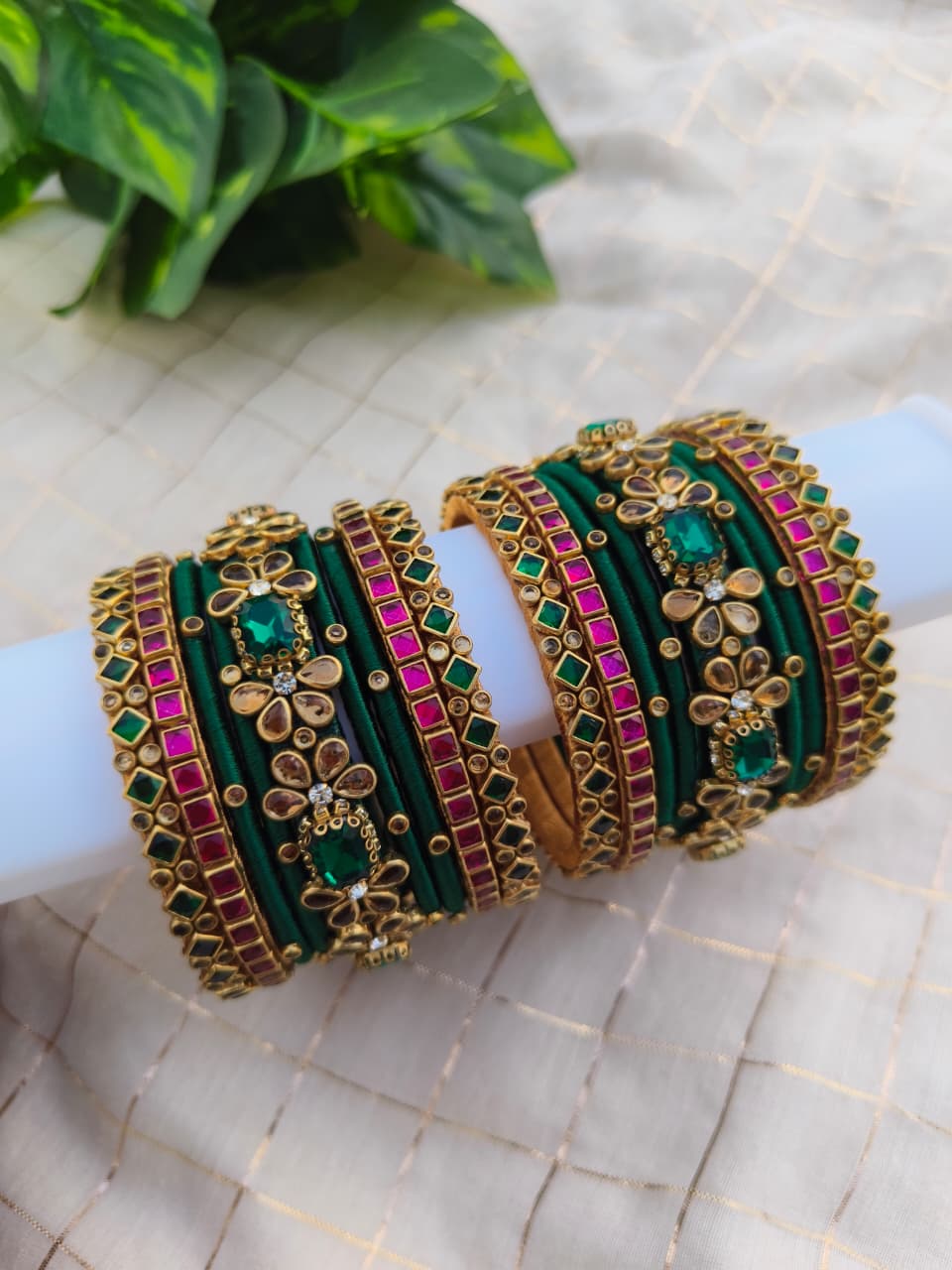 Experience the elegance of silk thread bangles adorned with glass accents, crafted exactly as shown in the picture for 2 hands . Enjoy the option to customize colors to suit your personal style. Each order is carefully handmade, with a production time of 7 to 12 days to ensure premium quality. For orders and assistance, connect with us on WhatsApp at https://wa.me/+919566639644